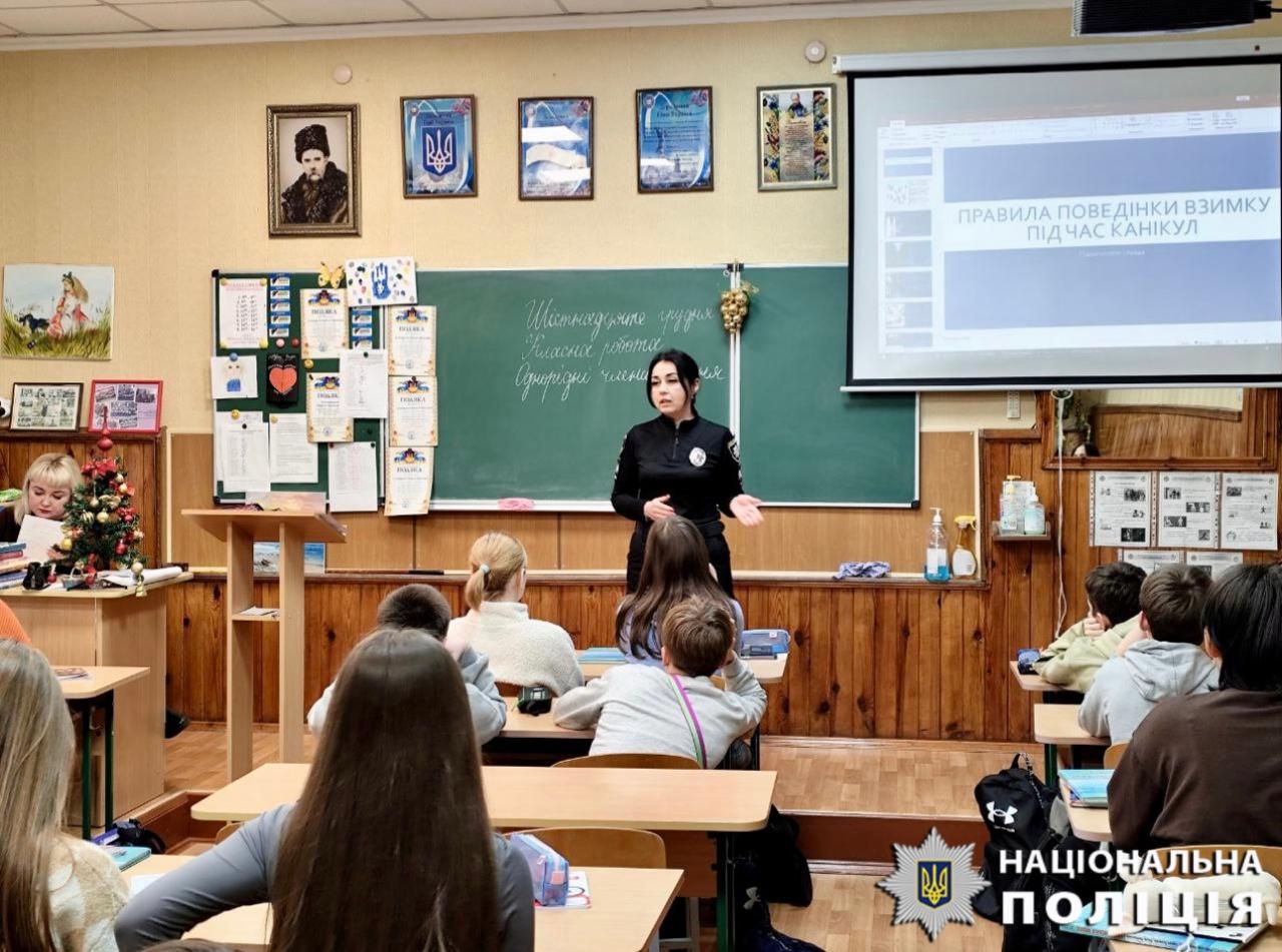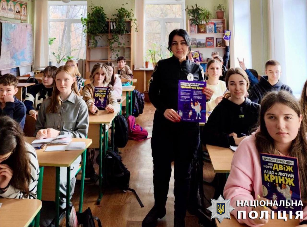 Правоохоронці нагадали учням Правила дорожнього руху, ознайомили з основними правилами поведінки на вулиці в темний час доби, на замерзлих водоймах, під час ожеледиці, а також у разі виявлення вибухонебезпечних предметів.
