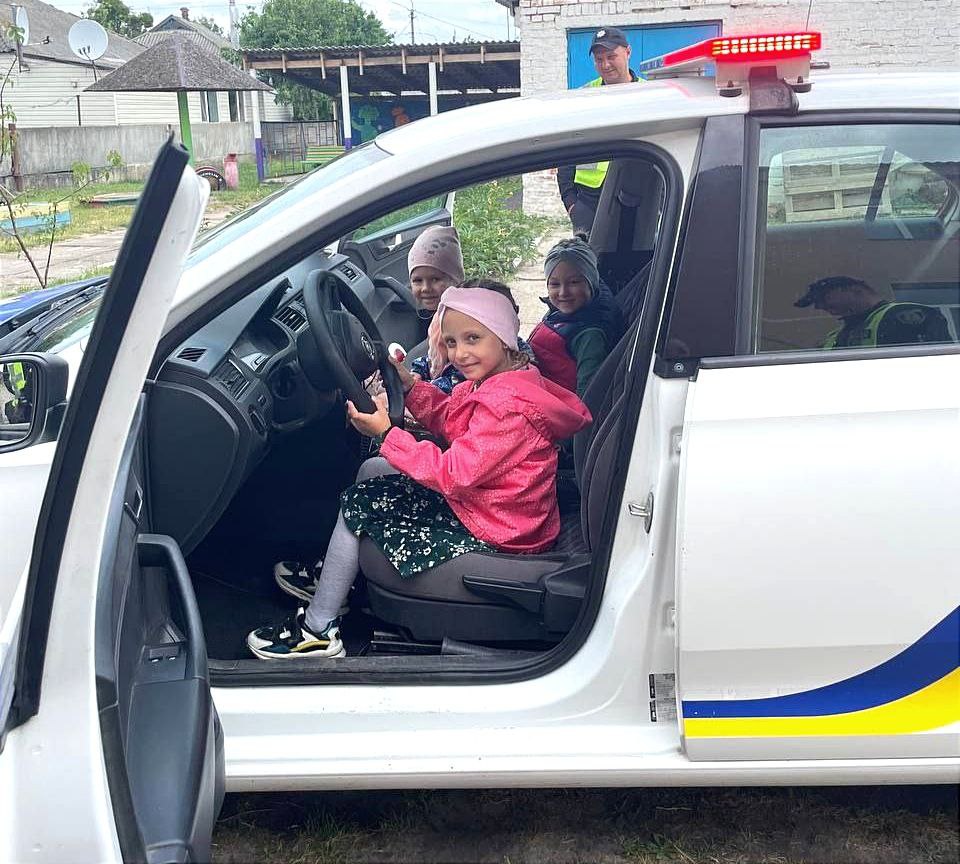 Діти із захопленням роздивлялися службове авто та слухали про роботу поліцейських. Наприкінці правоохоронці подарували наймолодшим жителям громади книжечки з прописами та світлоповертальні жилети.
