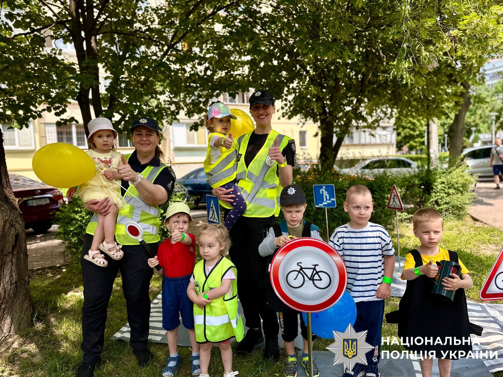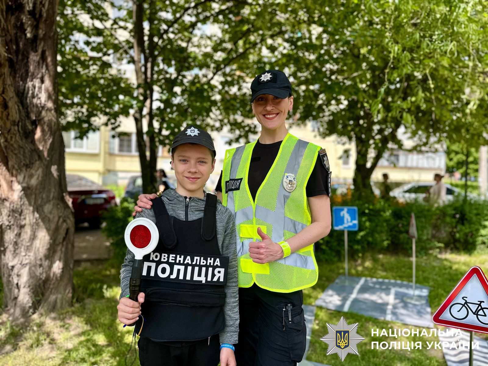 Ювенальні інспектори за допомогою імітованого дорожнього покриття продемонстрували дітям дорожні знаки та розповіли, як регулюють рух на шляхах. Крім того, дітворі надали можливість спробувати себе у ролі регулювальника дорожнього руху.