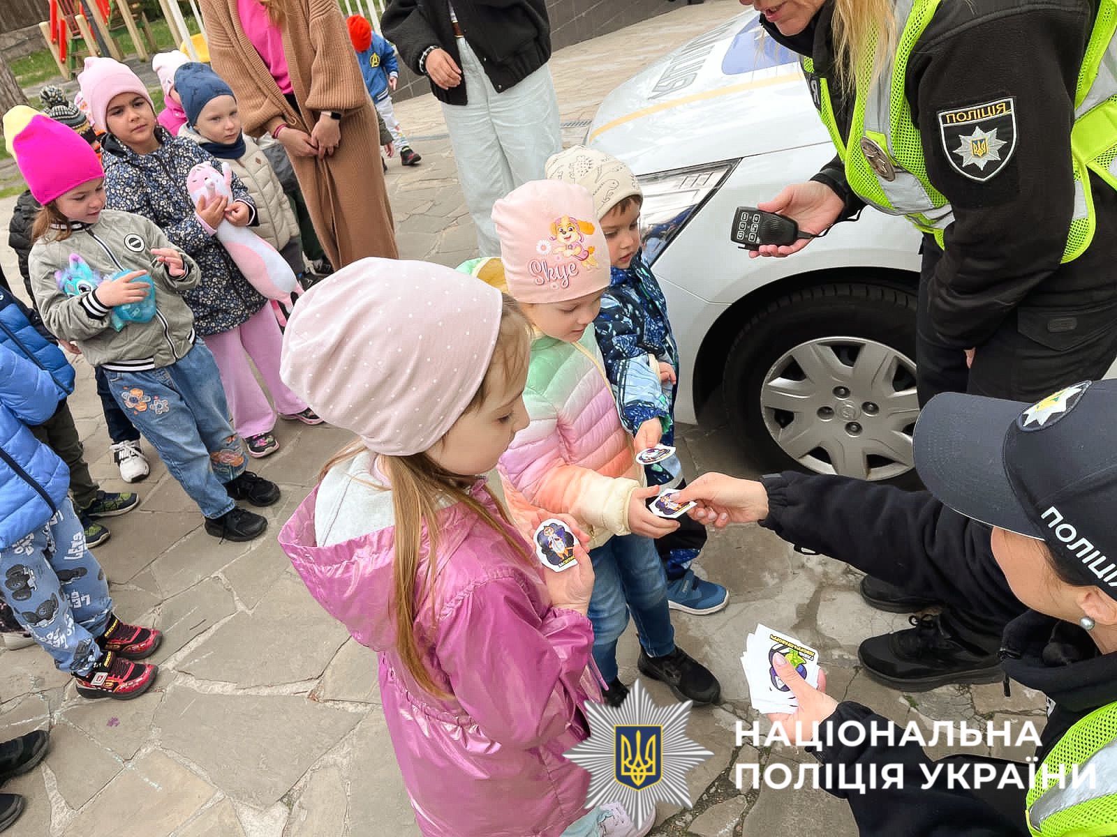 Наймолодші учасники заходу щиро подякували поліцейським за цікаву розповідь та подарували їм власноруч створені тематичні малюнки. Ювенальні поліцейські вручили кожній дитині наклейки щодо безпеки дорожнього руху.