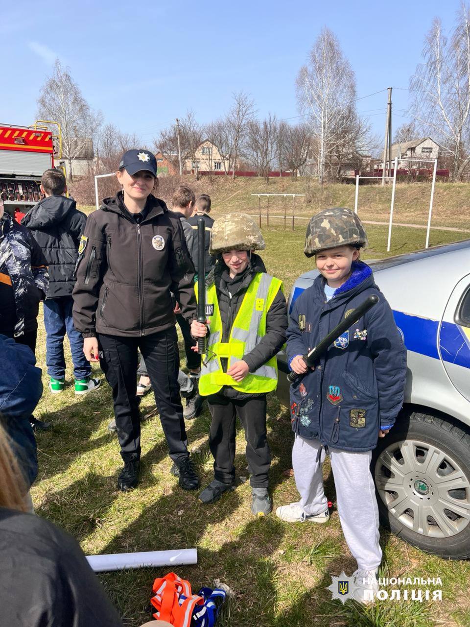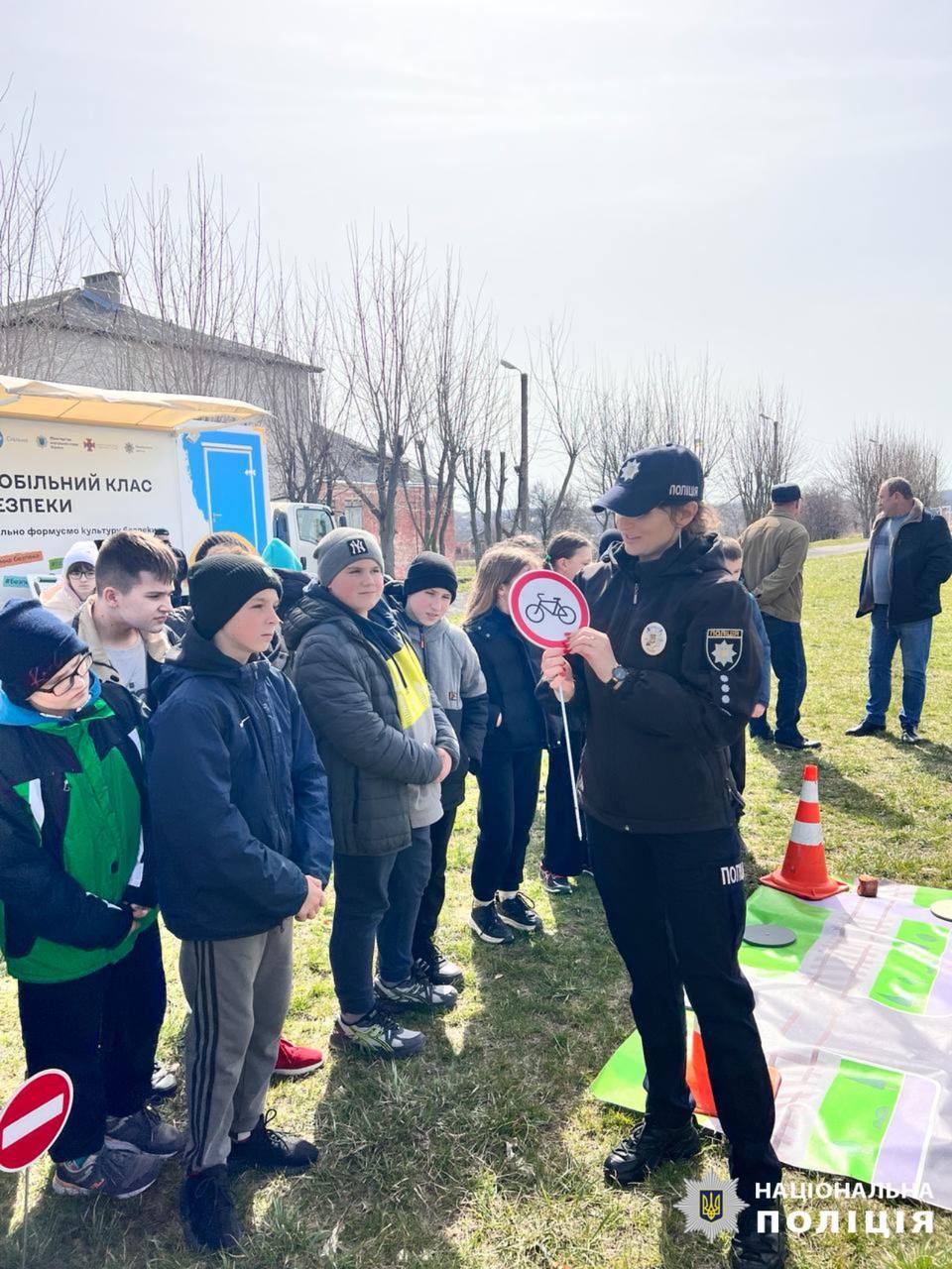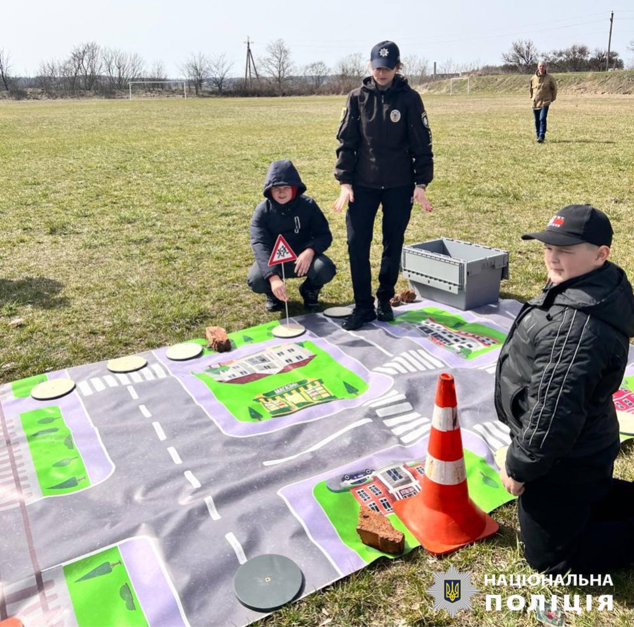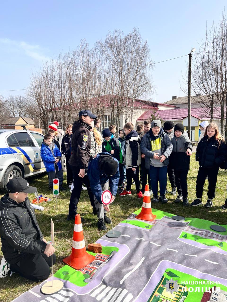 За допомогою імітованої дороги та дорожніх знаків, правоохоронці з дітлахами повторили правила дорожнього руху та правила безпеки в побуті.