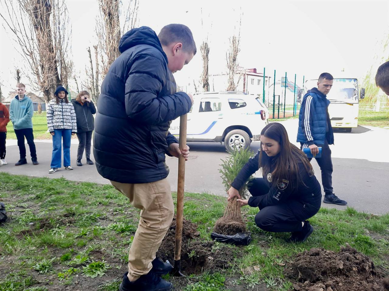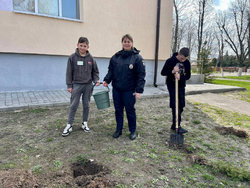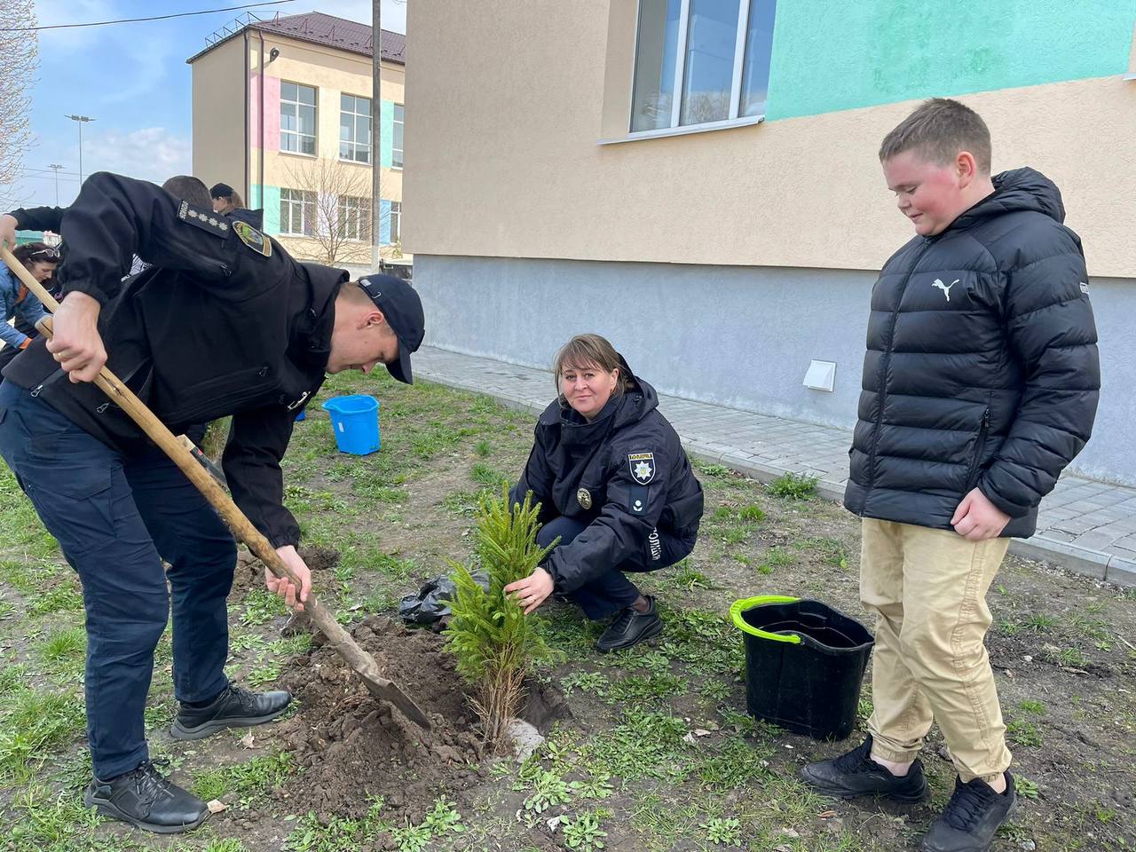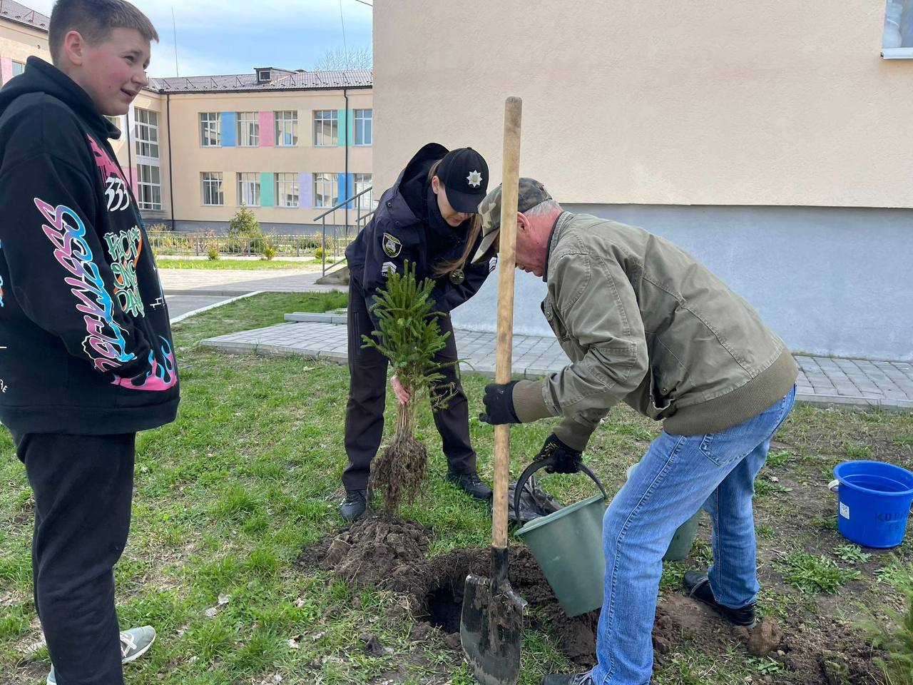 Інспектори ювенальної превенції спільно із поліцейським офіцером Зазимської громади долучилися до проєкту Президента України Володимира Зеленського «Зелена країна» та обласного природоохоронного флешмобу «Дерево перемоги». Також у заході взяли участь школярі навчального закладу села Погреби.