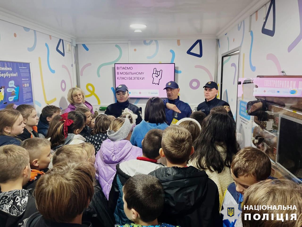 Ювенальна інспекторка та поліцейський офіцер громади ознайомили дітей з мобільним класом, розповіли його призначення та поспілкувалися про безпечну поведінку на дорозі. Також нагадали про адміністративну відповідальність за вчинення булінгу та кібербулінгу.