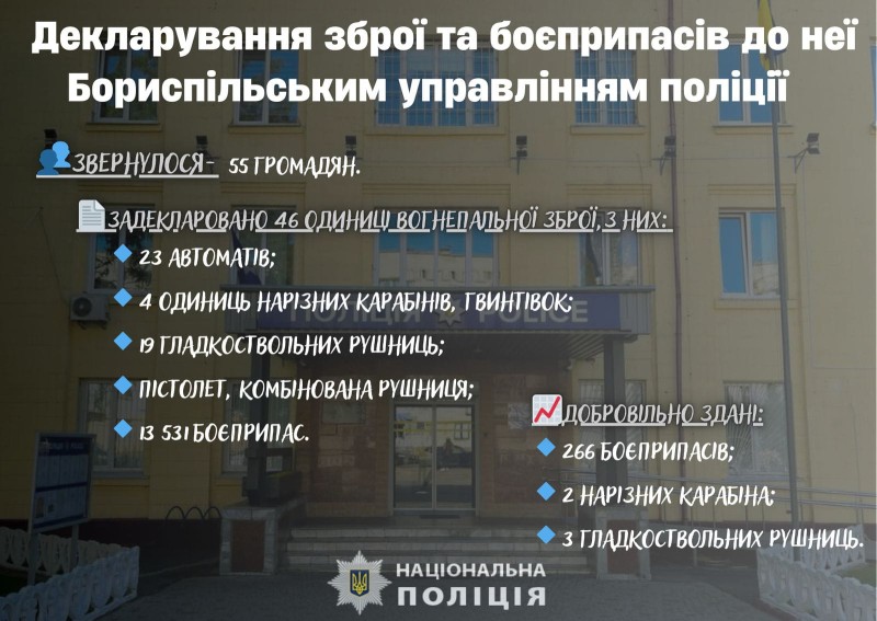 З початку декларування до підрозділів Бориспільського управління поліції звернулося 55 громадян, які задекларували 46 одиниць вогнепальної зброї, з них 23 автоматів, 4 одиниць нарізних карабінів, гвинтівок, 19 гладкоствольних рушниць, пістолет та комбіновану рушницю, а також близько 13 531 боєприпас. Ще 266 боєприпасів, 2 нарізних карабіни та 3 гладкоствольних рушниць були добровільно здані громадянами до поліції без декларування.