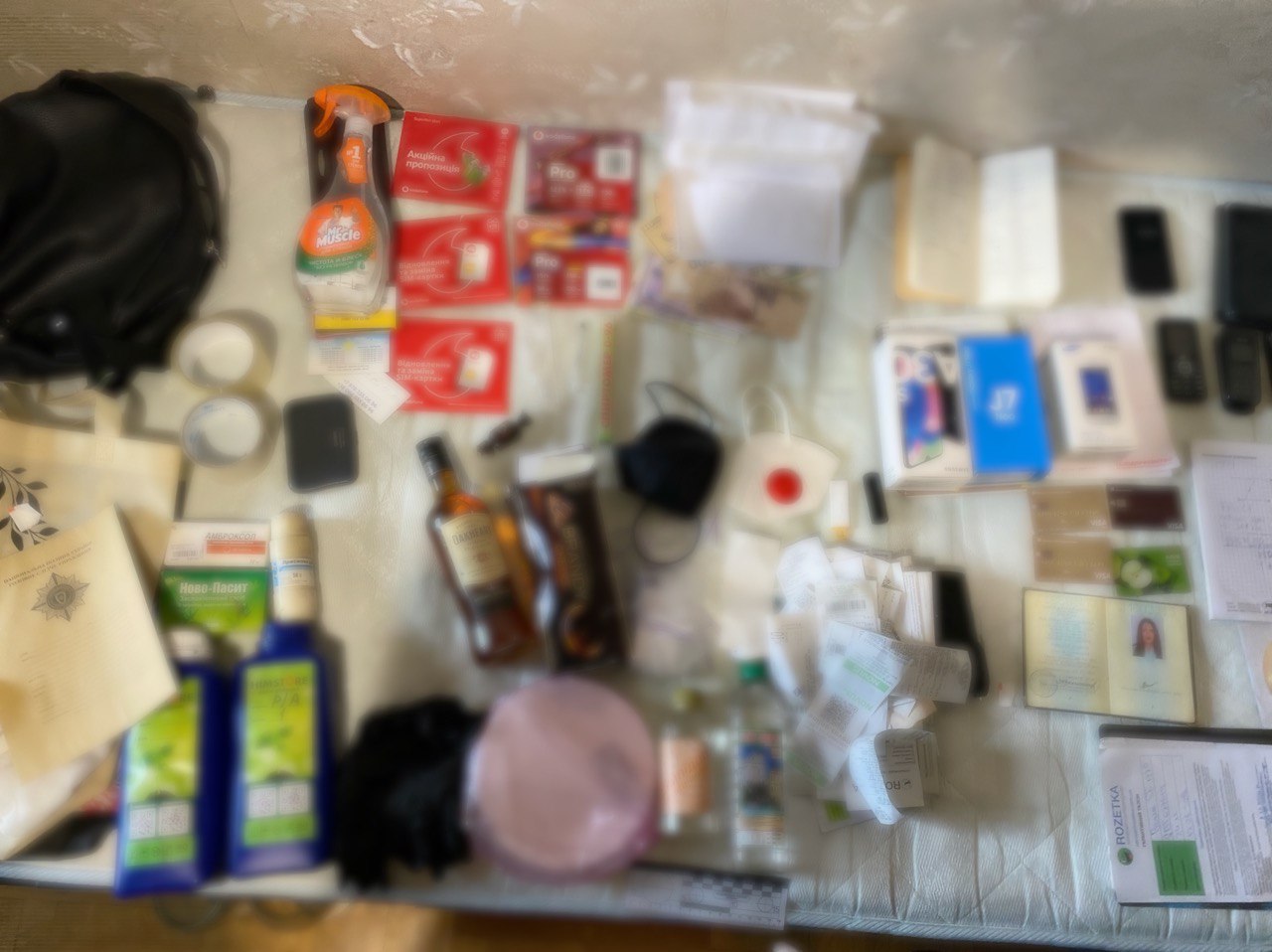 Під час санкціонованого обшуку у помешканні 35-річної зловмисниці було виявлено і вилучено ще дві пляшки алкоголю, телефони, стартові пакети, пляшки з невідомими рідинами, речі, у яких вона здійснила покупку «подарунків» та інші речі.
