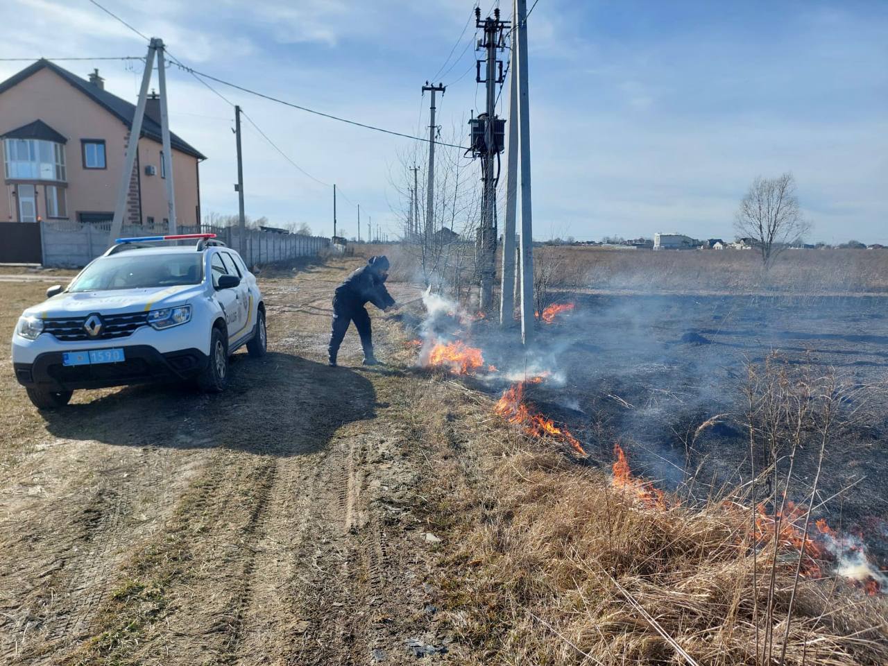 До офіцерів Калинівської громади Артема Казюкалова та Олександра Білоуса звернулася староста селища. Вона повідомила, що на одній із вулиць горить сухостій — вогонь розповсюджується у напрямку будинків.