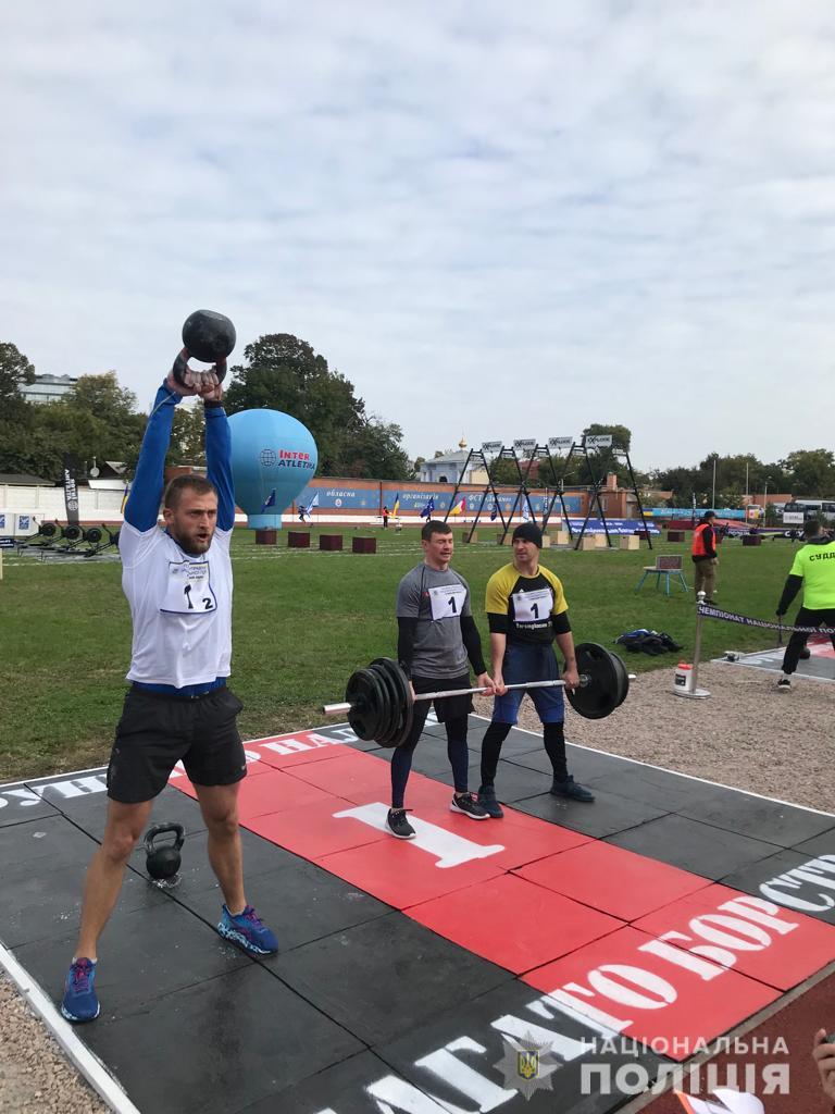 Поліцейські виконували командну естафету, в якій кожному потрібно було зробити 40 махів гирею, пробігти 400 метрів перестрибнувши 4 бар'єри та яму з водою, утримувати штангу вагою 140 кілограмів, а також виконати особистий комплекс, де поліцейські доводили свою міцність та витривалість.