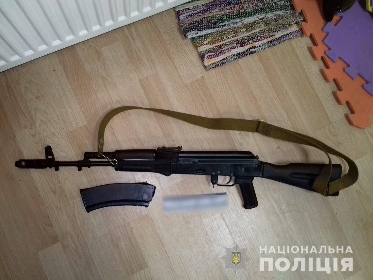 Під час відпрацювання території району, поліцейські вилучили у фігурантів 2 автомати Калашникова, понад 80 набоїв калібру 5,45 мм та 9 мм, два ножі, амфетамін та канабіс.
