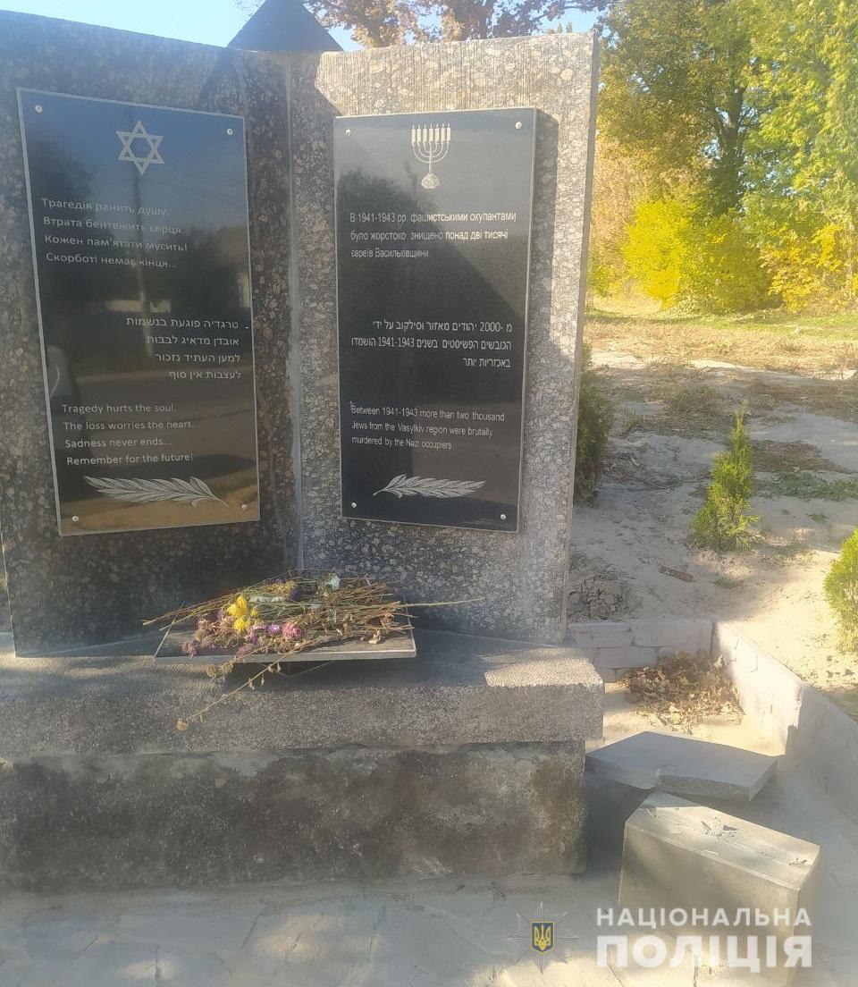 Сьогодні зранку під час моніторингу мережі Internet правоохоронці Київщини виявили публікацію про те, що в місті Васильків на вулиці Небесної Сотні поблизу стадіону «Кристал» пошкоджено пам'ятник жертвам Холокосту.