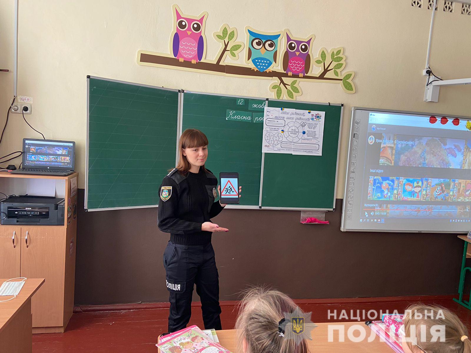 Працівник поліції нагадала дітям, як працюють світлофори і розповіла про види пішохідних переходів та особливості користування ними.