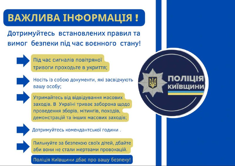 Поліція Київщини нагадує громадянам - у країні триває війна. Дотримуйтесь встановлених правил та вимог безпеки під час воєнного стану.