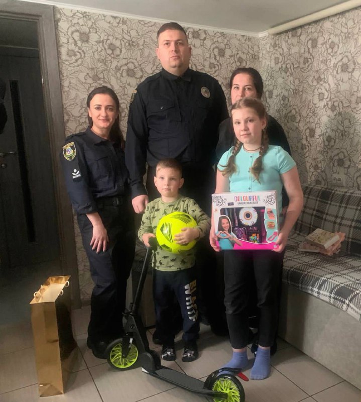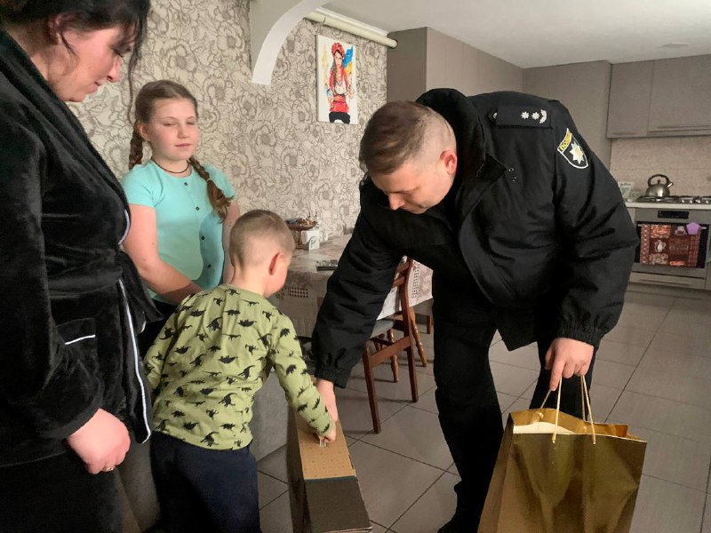 З нагоди Дня святого Миколая керівництво Броварського управління поліції Київщини завітало до сім’ї колеги. Правоохоронці привітали родину, поспілкувалися з ними, підтримали та подарували дітям подарунки і солодощі. Напередодні поліцейські дізналися про історію 5-річного Єгора, у якого під час окупації російські військові відібрали самокат, подарований батьками. Тому правоохоронці обрали для хлопчика омріяний подарунок.