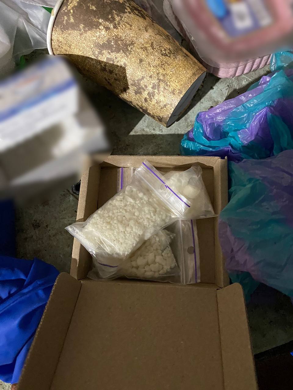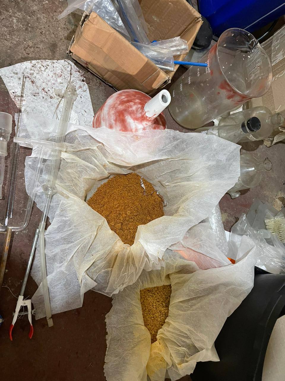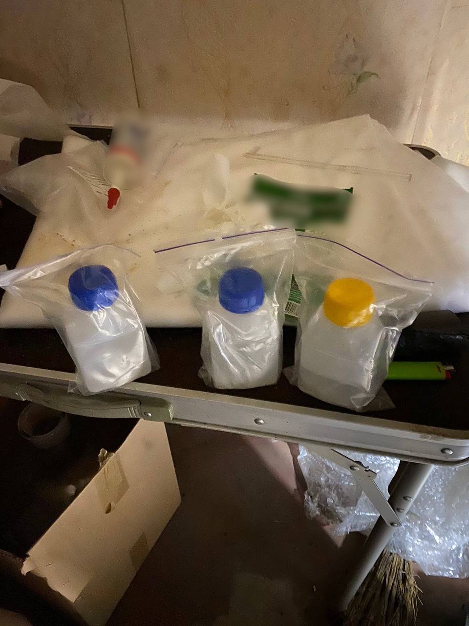 Проведено понад 20 обшуків, під час яких виявлено та вилучено наркотичні засоби та психотропні речовини, мобільні телефони, грошові кошти, банківські картки, рації, набої, блокноти з чорновими записами щодо виготовлення наркотичних засобів, лабораторне обладнання, спецодяг та респіратори.