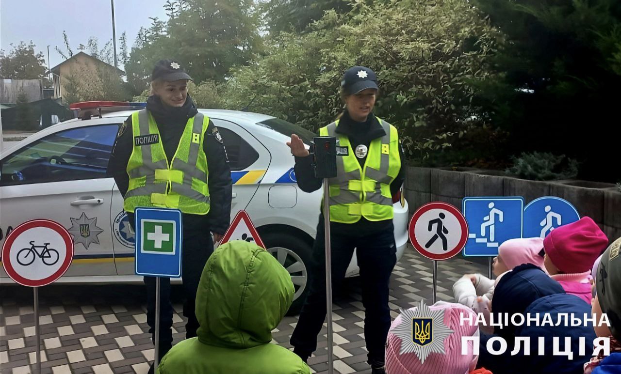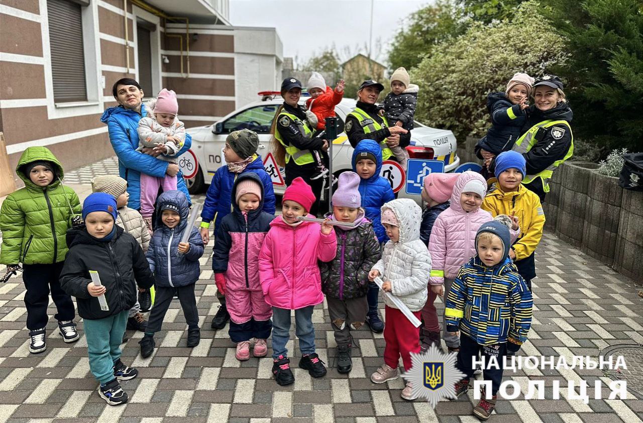 Поліцейські в ігровій формі розповіли дітям про основні правила дорожнього руху та продемонстрували дорожні знаки. Також наголосили на важливості бути помітними у темну пору доби та роздали малечі різнокольорові світлоповертальні браслети.