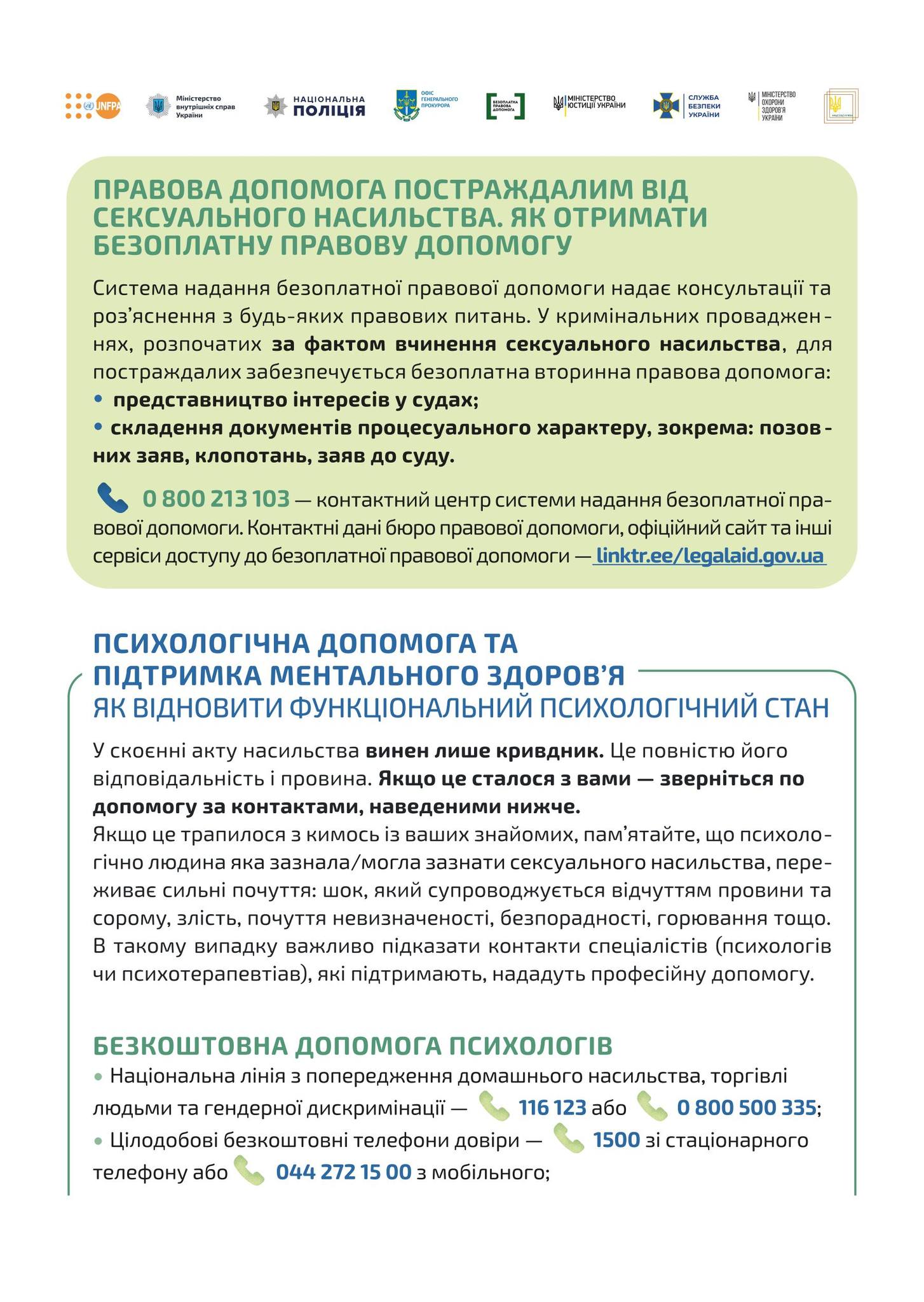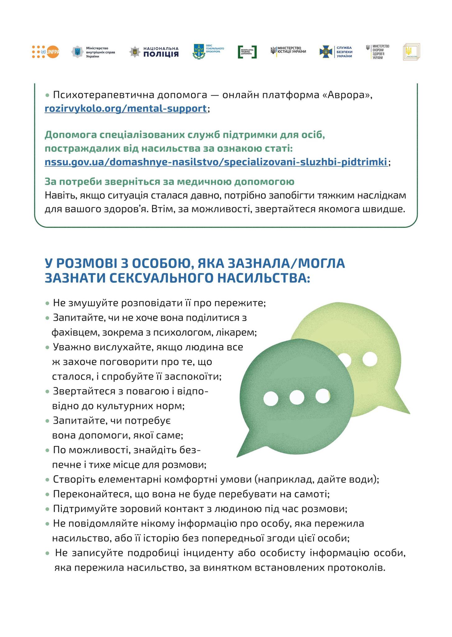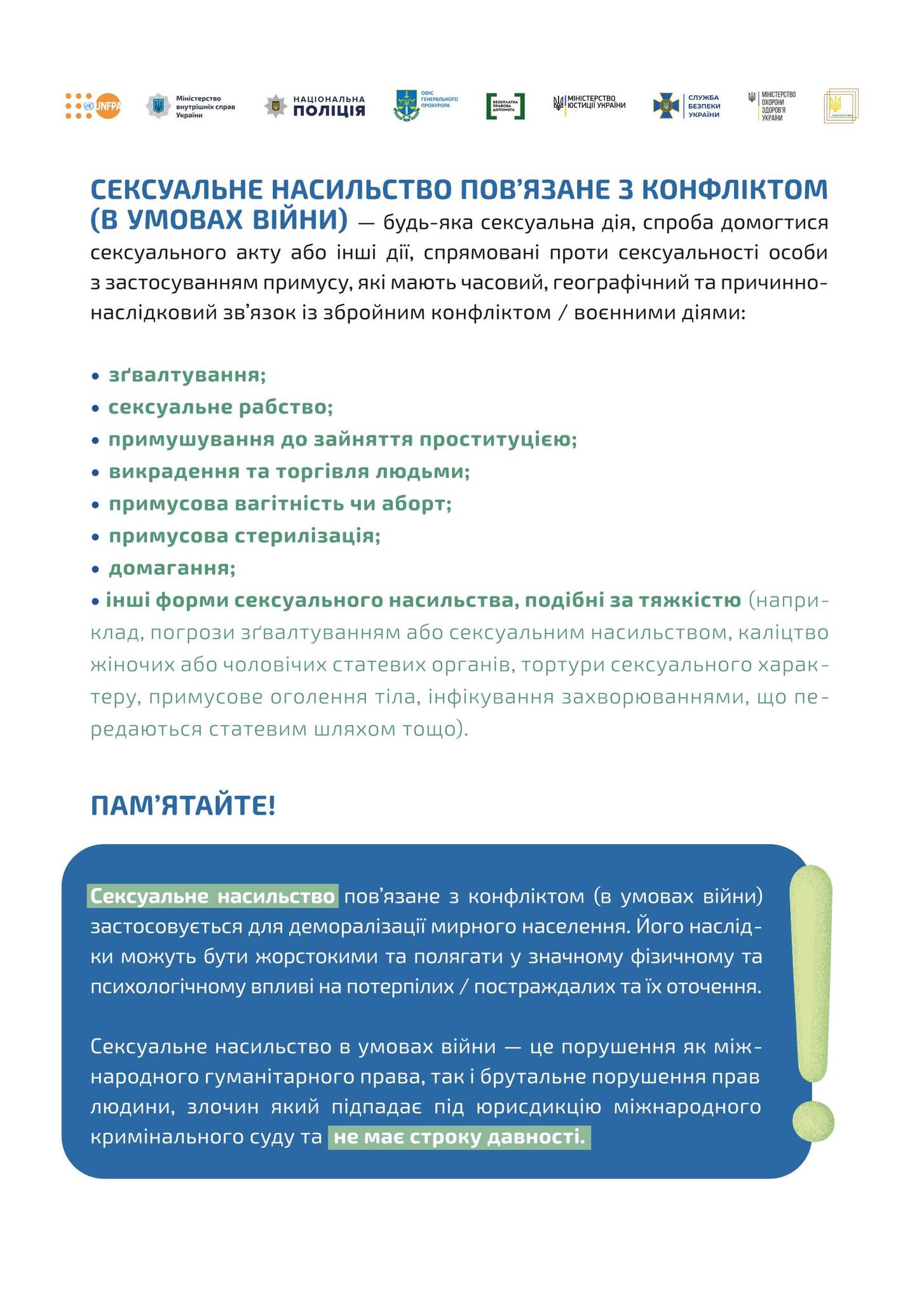 В буклеті детально описано що саме є сексуальним насильством в умовах війни, куди має звернутися постраждала особа для отримання правової та психологічної допомоги, яку інформацію необхідно надати, а також поради, як вести розмову з постраждалою особою.