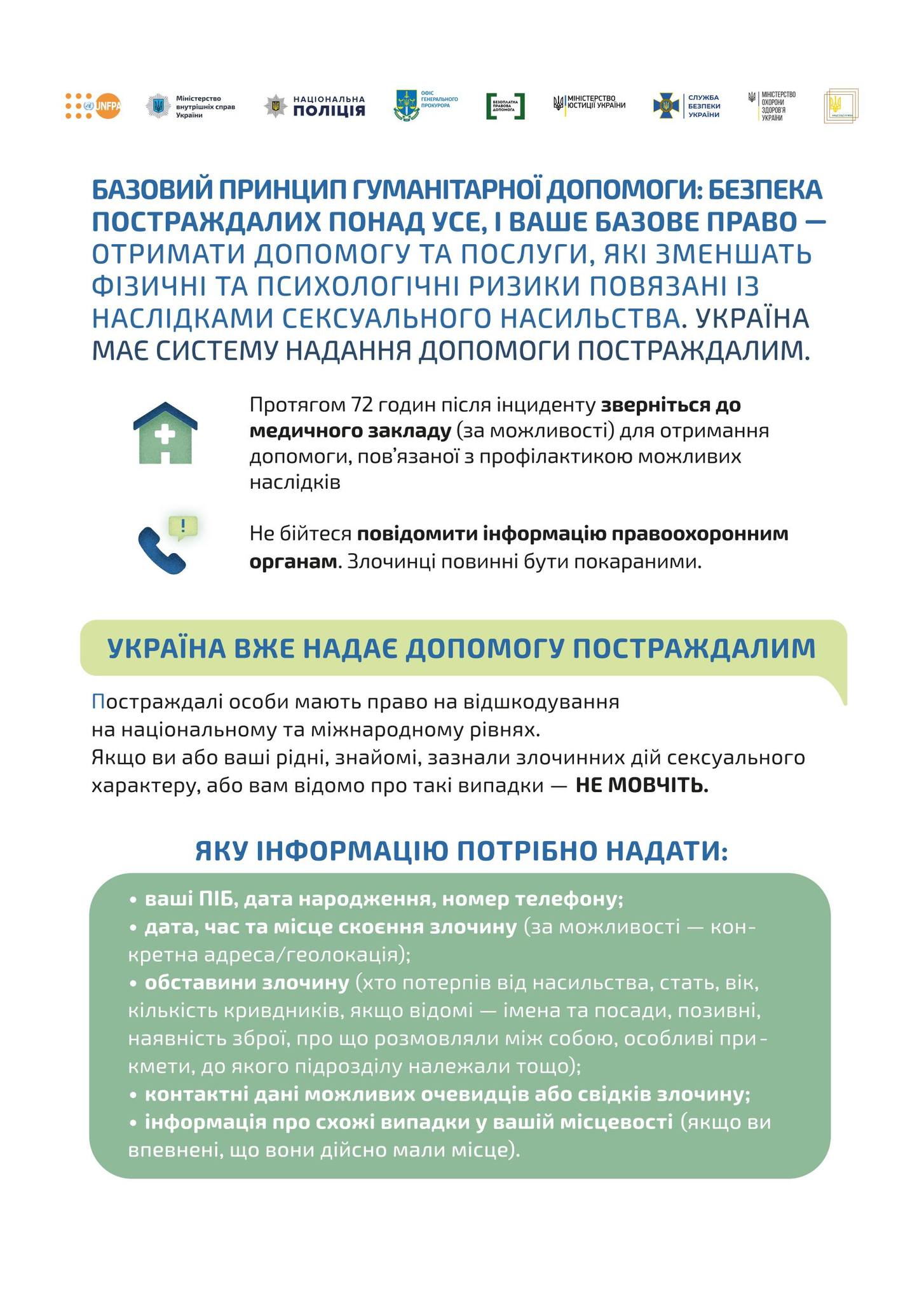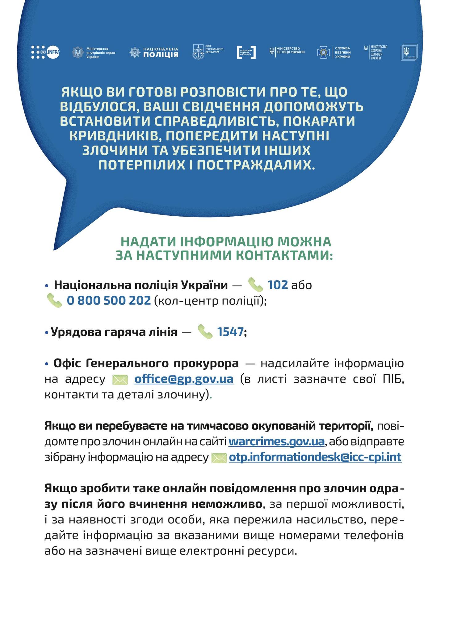 Буклет розроблено за ініціативи Міністерства внутрішніх справ України при підтримці Фонду ООН у галузі народонаселення (UNFPA), за участі Національної поліції, Служби безпеки України, Офісу генерального прокурора, Міністерства юстиції України та Міністерства охорони здоров’я України з метою поширення інформації щодо дій постраждалих або свідків воєнного злочину, зокрема, сексуального насильства пов’язаного з конфліктом.