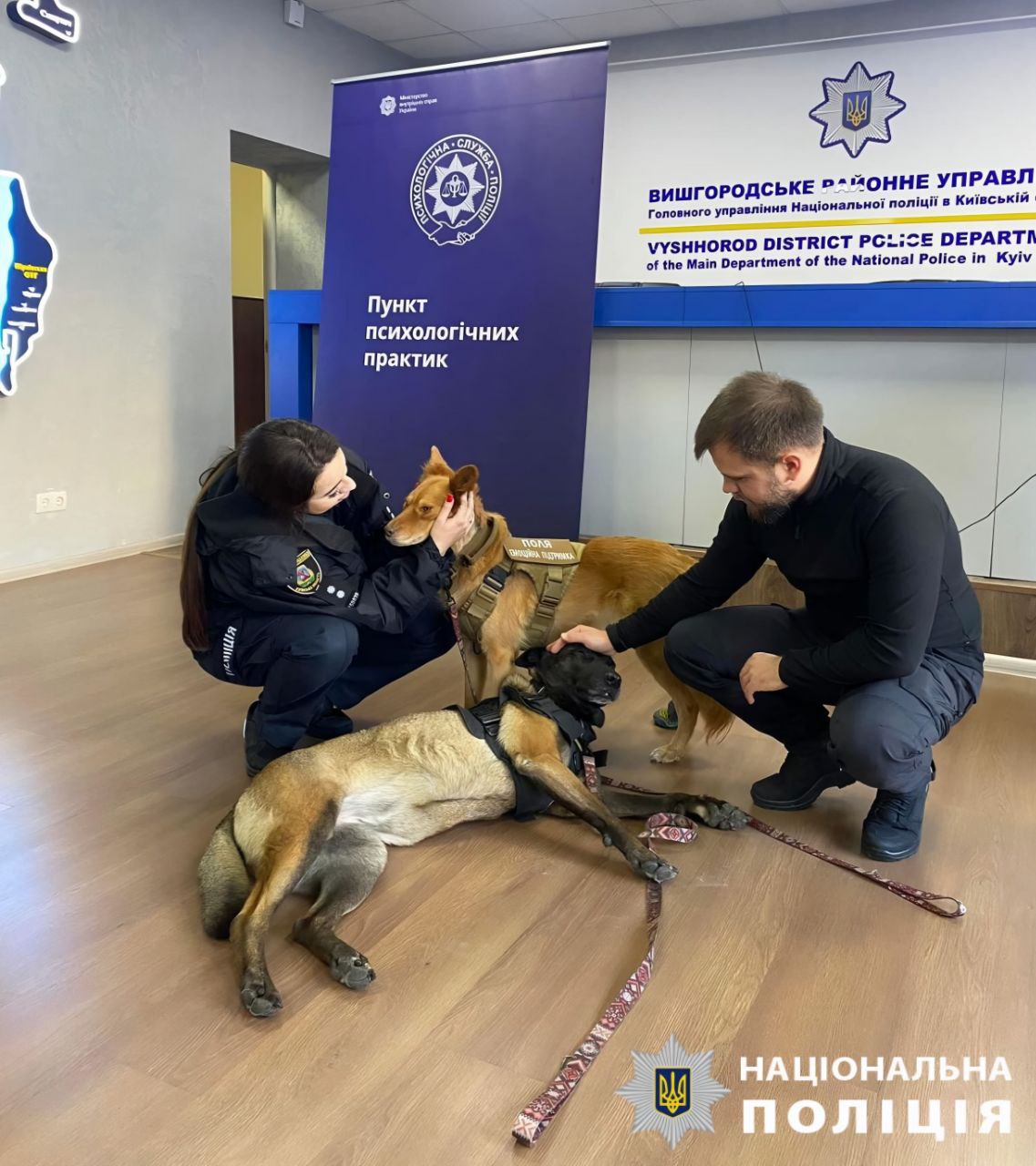 Днями, в рамках проєкту «Пункт психологічних практик» для правоохоронців Вишгородщини відбувся спеціальний тренінг із залученням службових собак психоемоційної підтримки. Заняття провели кінолог Кінологічного центру поліції Київщини Катерина Бєляєва та психолог управління поліції Дарина Шматко.