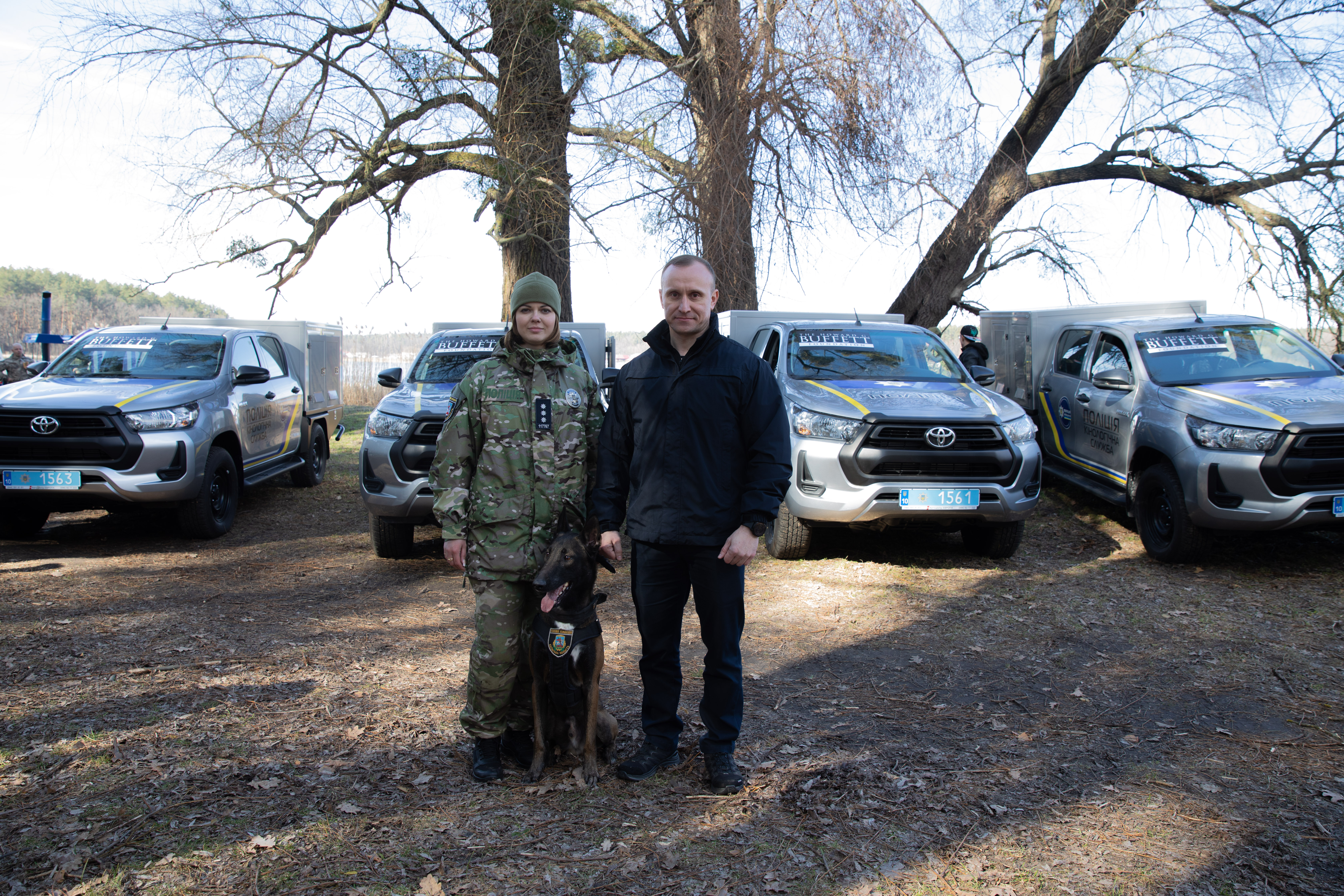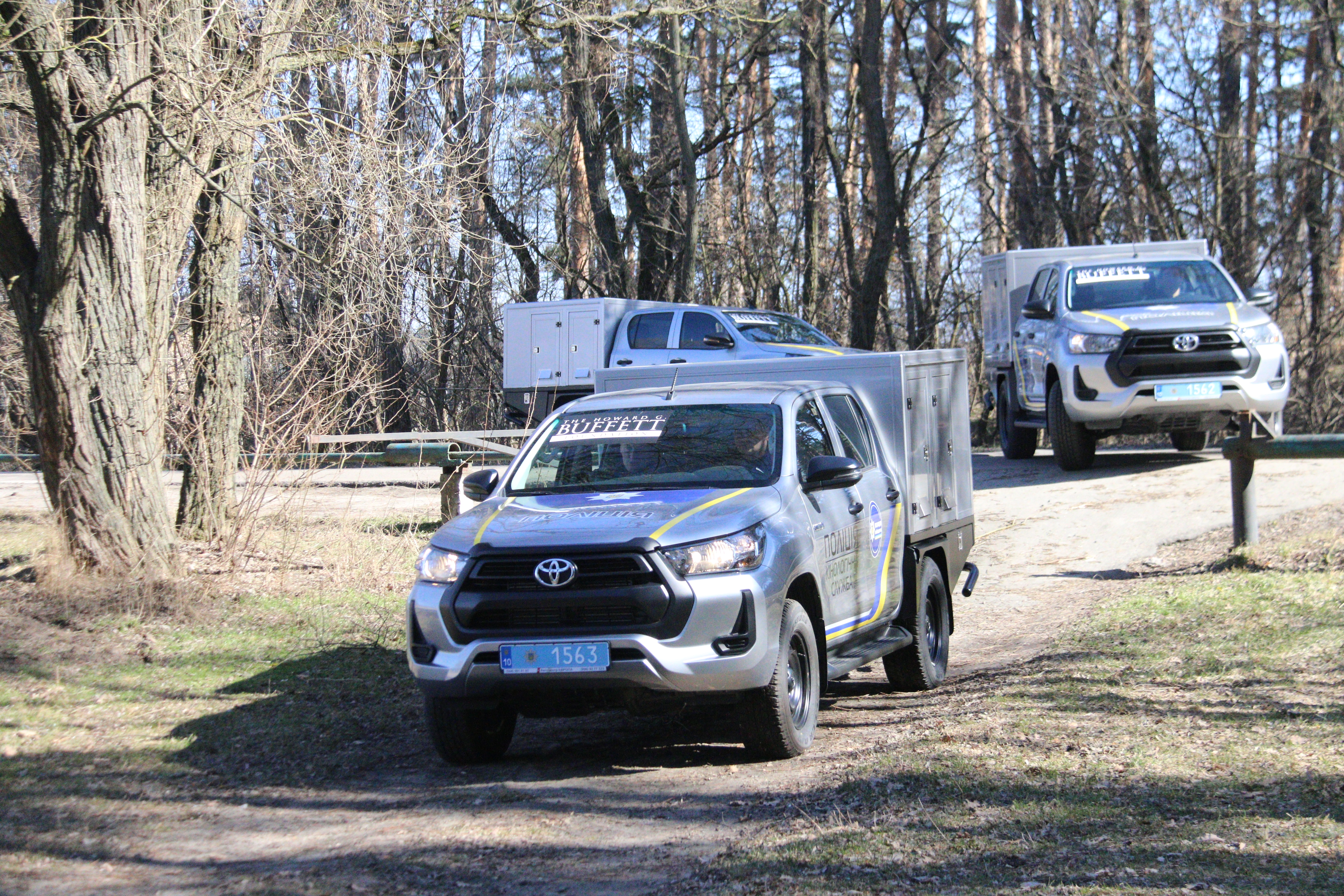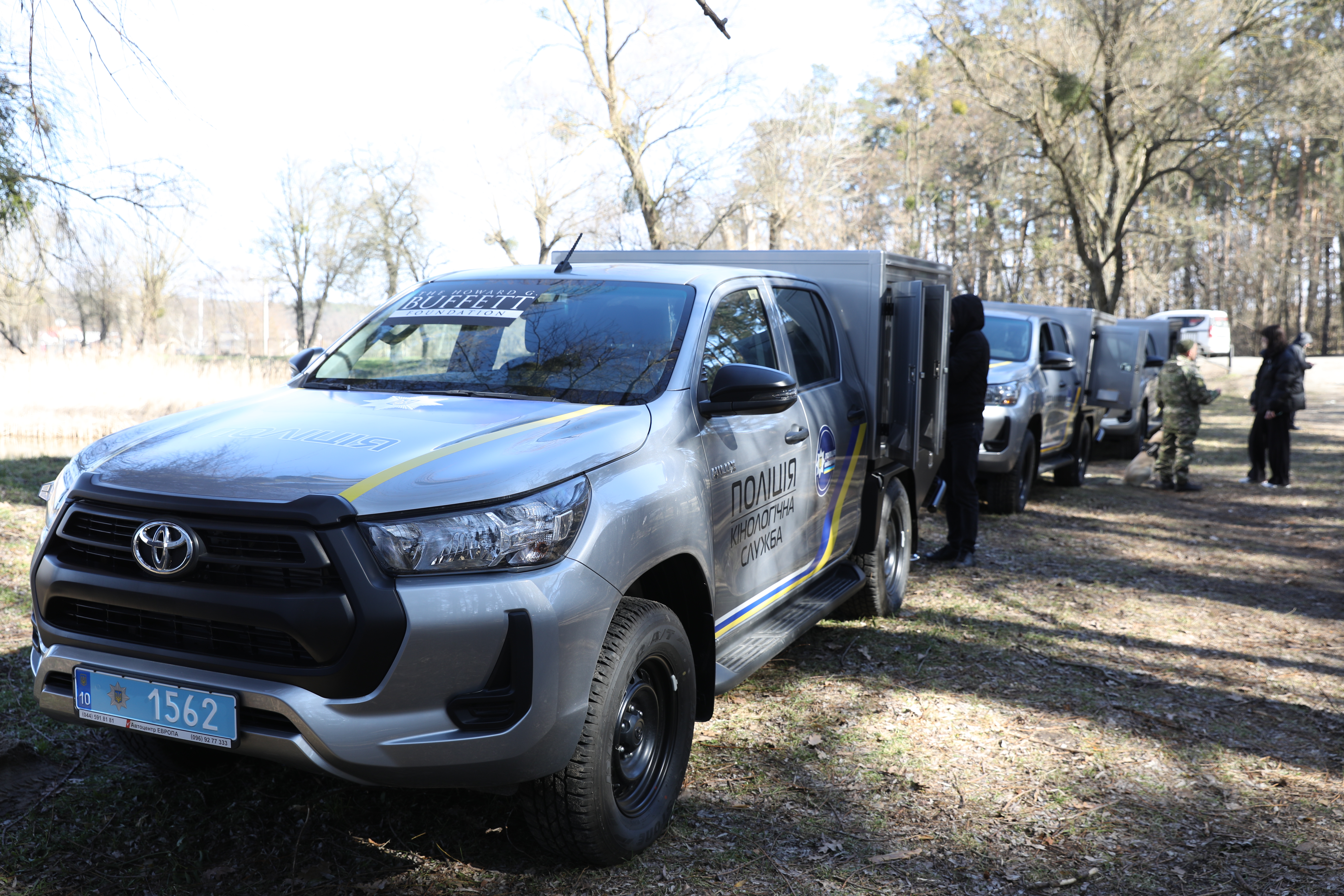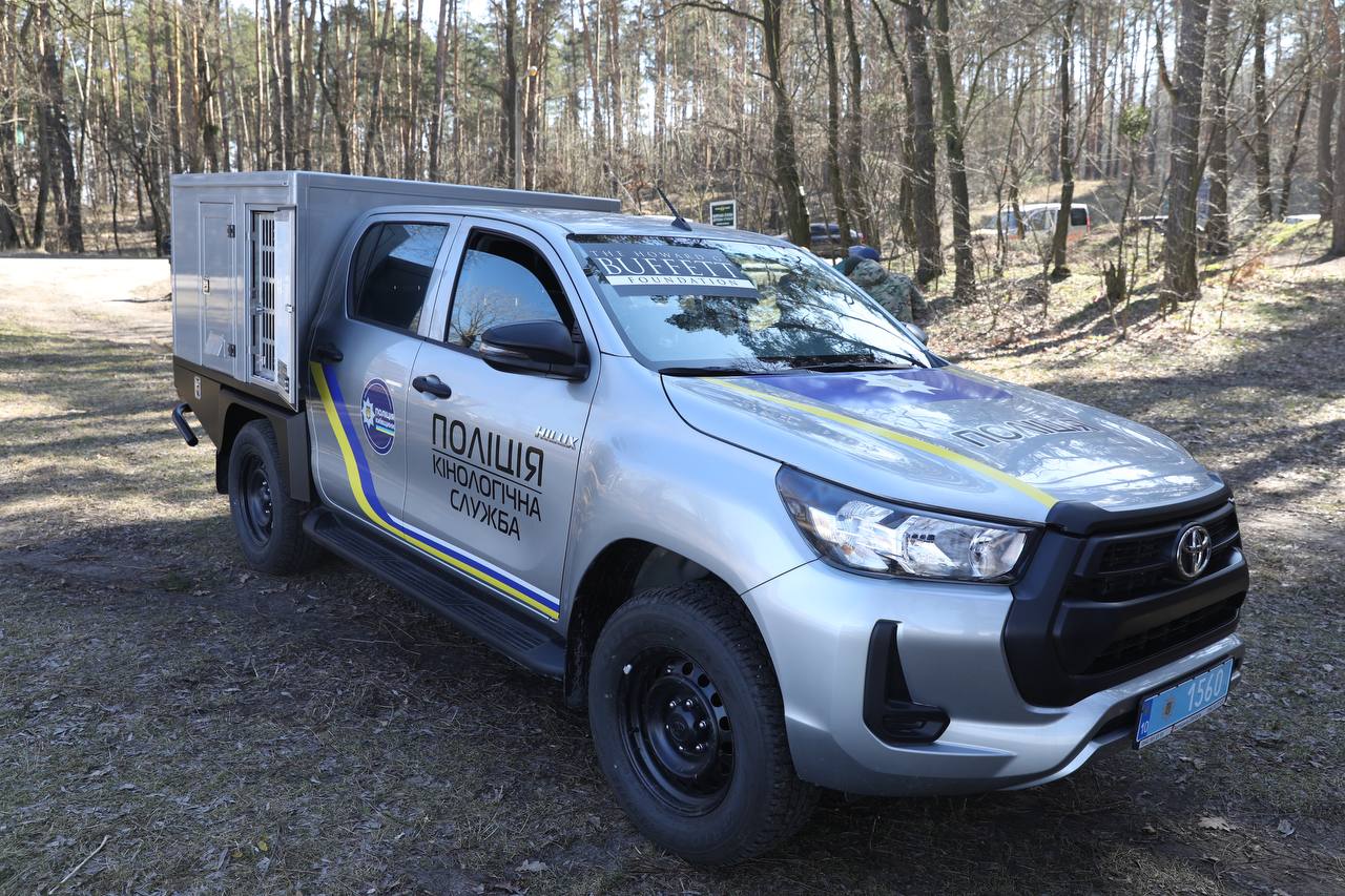 Чотири спецмобілі Toyota Hilux прибули сьогодні для кінологів поліції Київщини від фундації Howard G. Buffett Foundation.